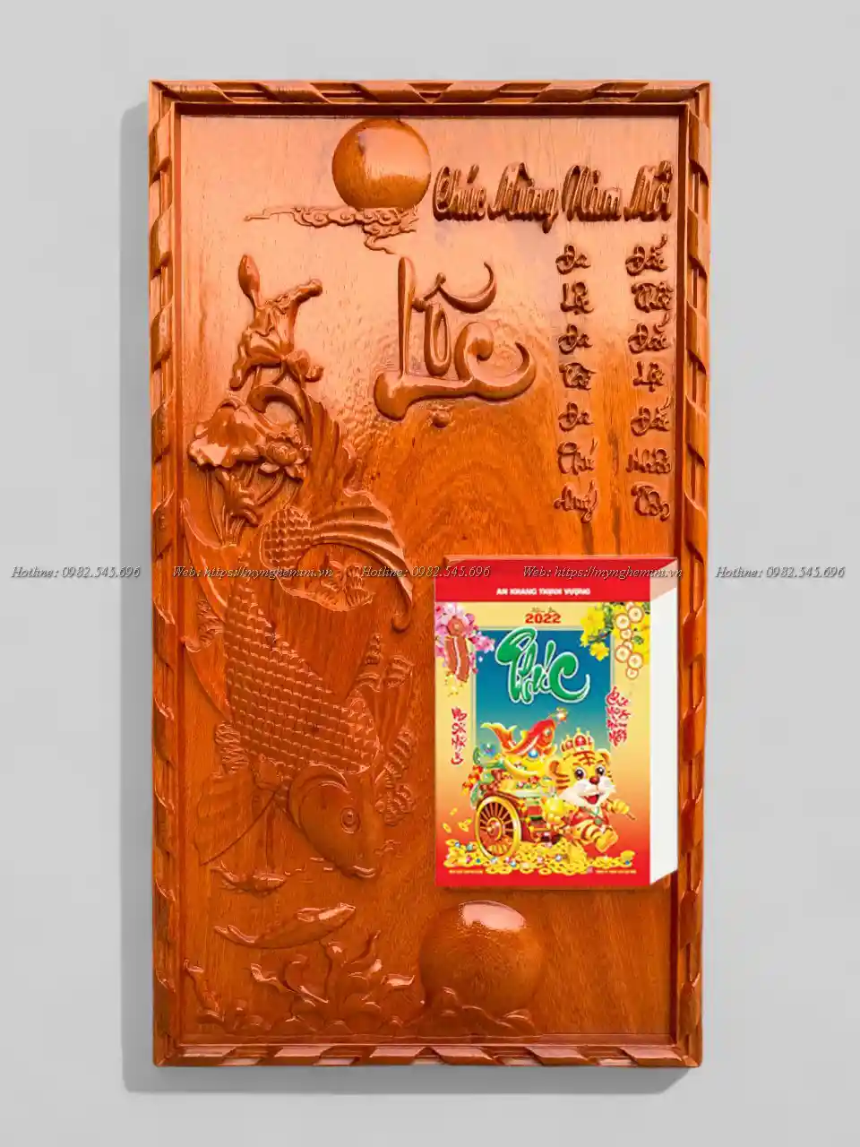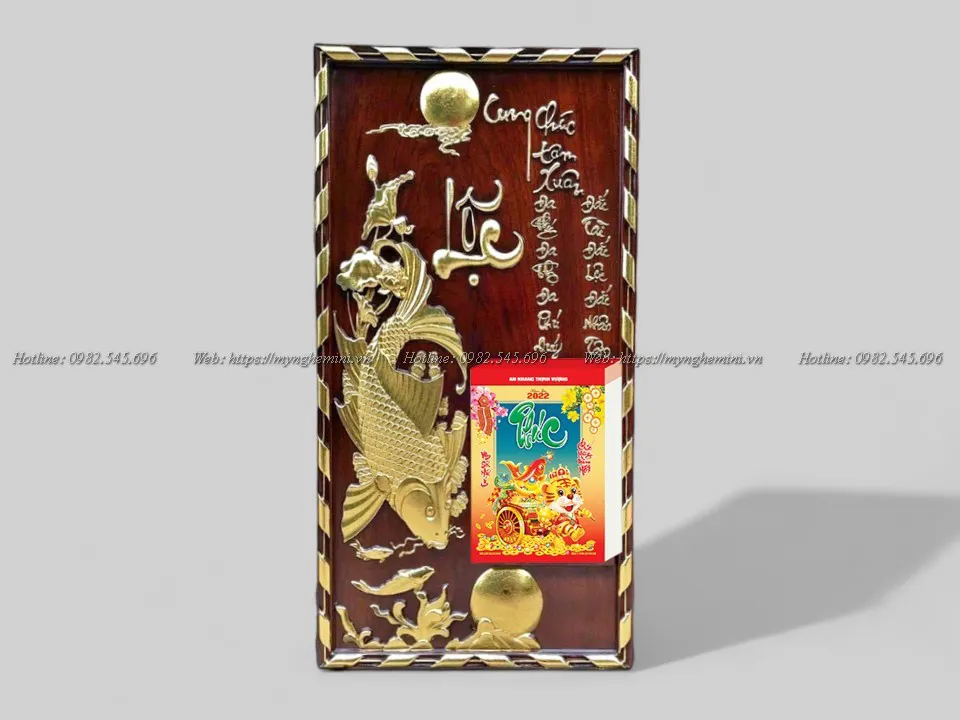 Đốc lịch treo tết đục cá chép chơi trăng dùng để treo lịch năm mới làm bằng gỗ tự nhiên cao cấp.